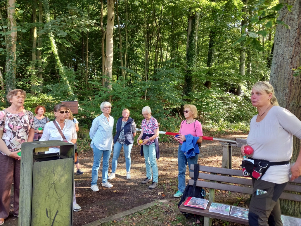 Mit diesen neu gewonnenen Kenntnissen im Kopf wanderten wir am 19. September bei bestem Spätsommerwetter mit Frau Raupers-Greune auf dem Lavespfad in Derneburg. Zuerst sollten wir uns Bilder einprägen und sie dann auf der Wanderung wieder erkennen. An vielen Stationen haben wir verschiedenste Übungen absolviert, z.B. einem Igelball auf Kommando hin und her gereicht. Es wurde ebenso auch der Tast- und Geruchssinn trainiert. Ein Höhepunkt war das Alphabet rückwärts aufzusagen (hier half uns ein Merksatz). Am Ende unseres Weges gab es eine Stärkung und es wurde gemeinsam gesungen.